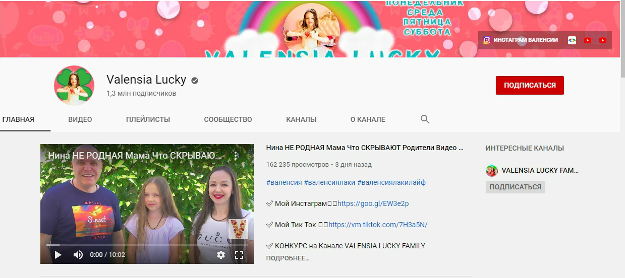Чуть позже, в 2020 году, Валенсия создала профиль на YouTube под названием Valencia Lucky life. Сайт посвящен семейным путешествиям, некоторым событиям из жизни, покупкам и посещению интересных мест. Счет очень быстро растет. С учетом того, что канал зарегистрирован сравнительно недавно, его аудитория уже превышает 60 тысяч человек. люди.