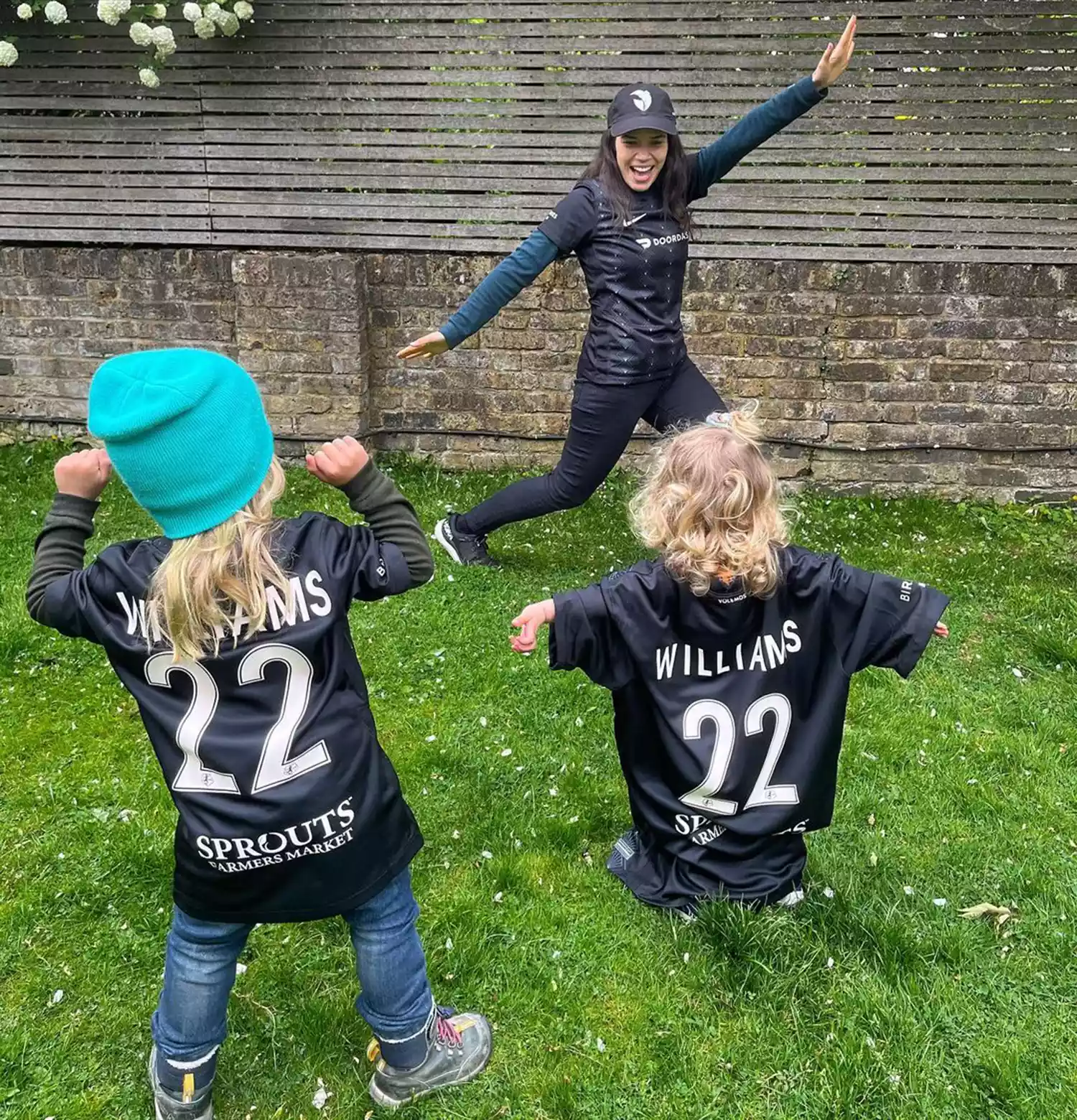 America Ferrera playing with her kids, Sebastian and Lucia, outdoors.