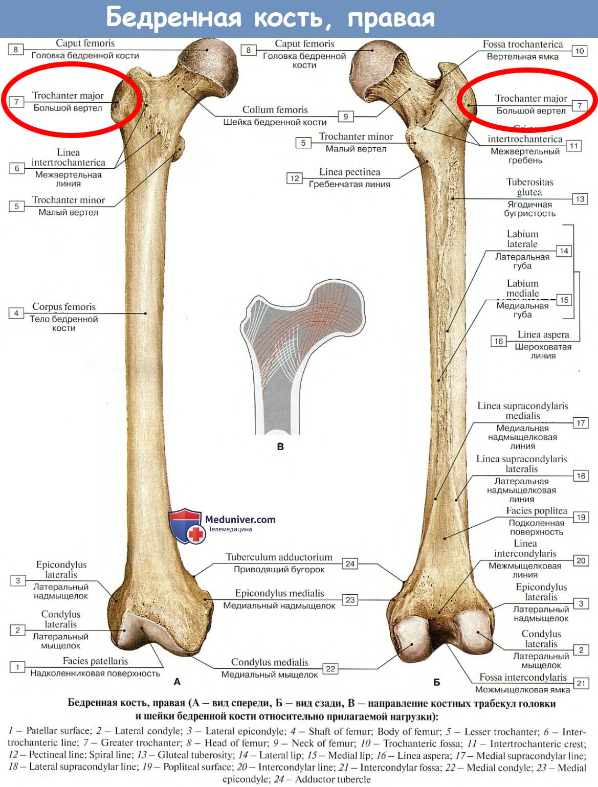 Большой вертел – выступ на верхней части бедренной кости, далее соединяется с малым вертелом межвертельной бороздой. К этим местам крепится группа ягодичных мышц и капсула тазобедренного сустава.
