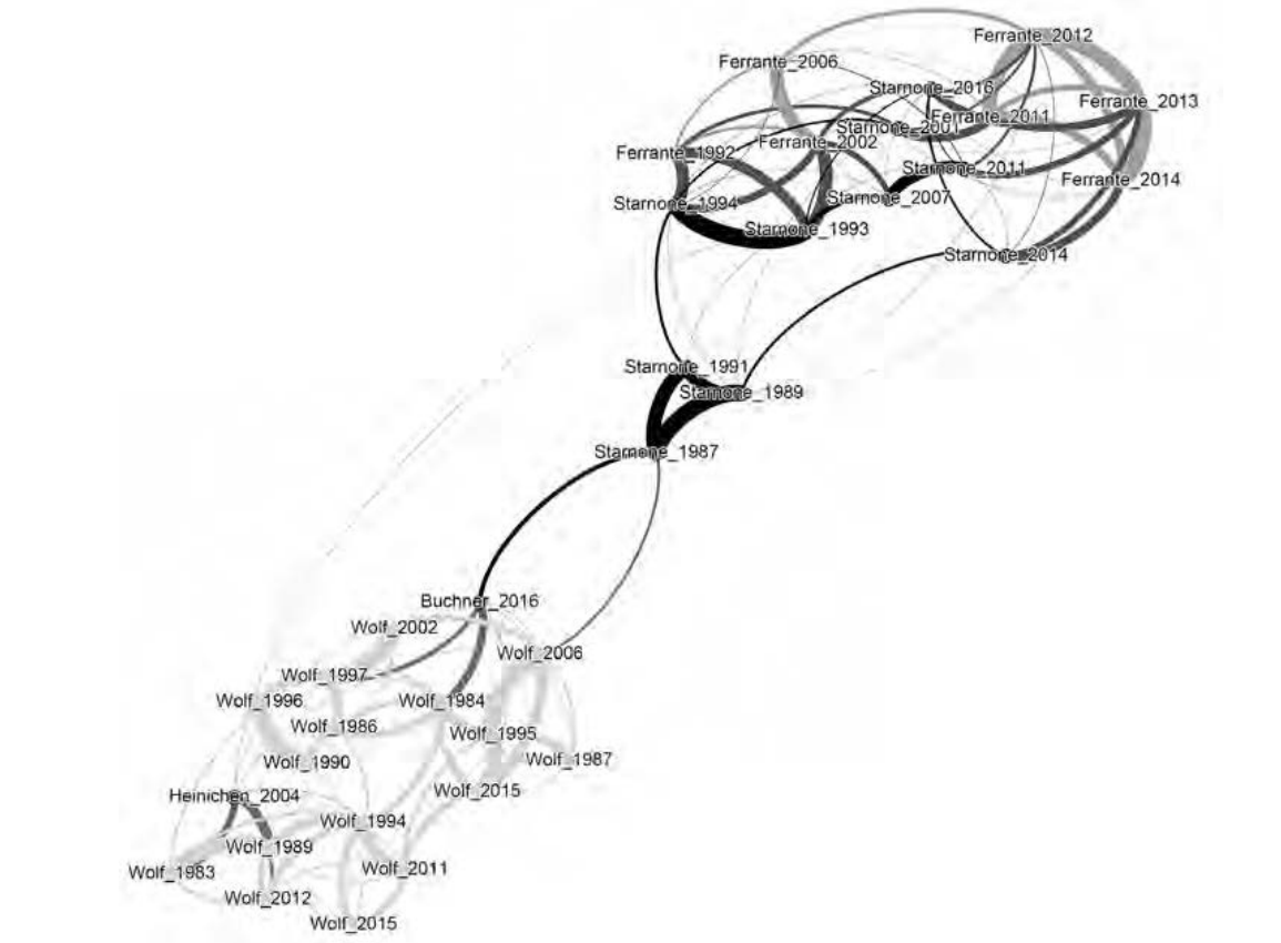 Рисунок 8. Сеть для 150 романов и переводов текстов Кристы Вольф. Черной дугой выделен кластер «доферрантовских» текстов («Starnone Pre-Ferrante»).