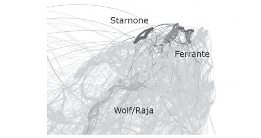 Коллега Мачея Эдера, другой известный польский стилометрист Ян Рыбицки, в своем исследовании опирается на уже упомянутую статью Клаудио Гатти о причастности переводчицы Аниты Райа к романам Ферранте и на уже известный корпус из 150 современных итальянских романов. Он задался вопросом, может ли Райа быть (со)автором романов Ферранте. В этот корпус он добавляет 16 переводов романов Кристы Вольф (14 из которых выполнены Райа, 2 — двумя другими переводчиками) и коллекцию из 1200 произведений на итальянском языке. Рыбицки использует Stylo и косинусное расстояние. Полученные расстояния между текстами используются для кластеризации методом Уорда. Как и Эдер, для визуализации Рыбицки использует Gephi и алгоритм Force Atlas 2.