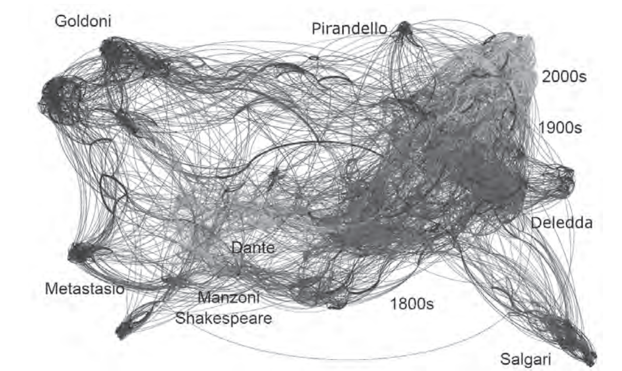 Полученная таким способом сеть (Рис. 6) демонстрирует несколько характерных явлений. Во-первых, жанровое разделение: к левой части сети тяготеют драматические тексты, к правой — эпические. Во-вторых, заметна литературная эволюция: некоторые тексты в сети расположены в хронологическом порядке (см. даты на графике). Также в отдельные кластеры попадают тексты Сальгари, Деледда и Пиранделло: это характерно для корпусов, отличающихся стилистической гомогенностью.