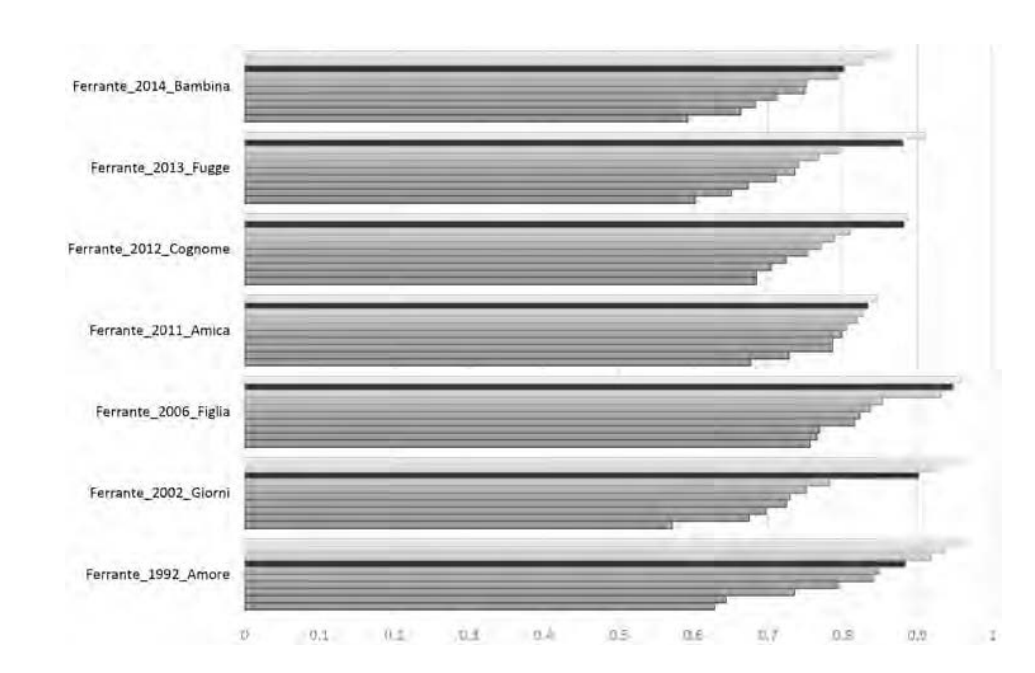 Рисунок 10. Косинусные расстояния для текстов Ферранте. Самые короткие — при сопоставлении с романами Старноне (оттенки серого), самые длинные — при сопоставлении с переводами Райа (черный цвет).