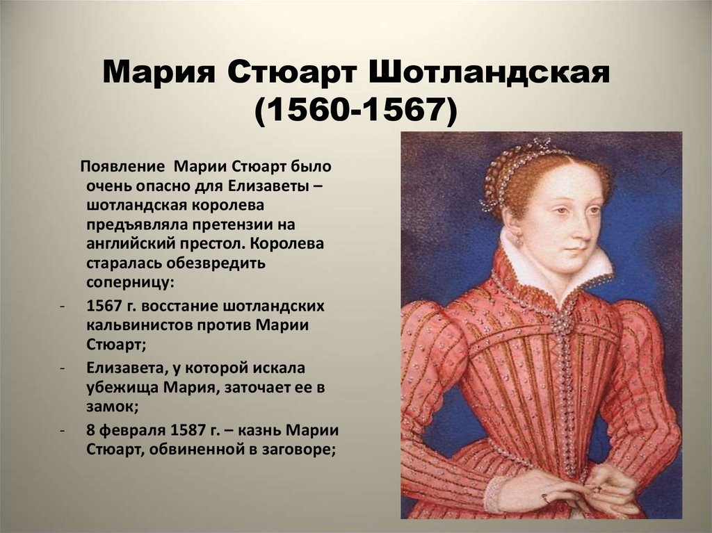 А вот законность Марии Стюарт не ставилась под сомнение — она приходилась правнучкой королю Генриху VII. Мария имела законные права на трон Англии, и этот вопрос встал перед ней после смерти королевы Марии Тюдор. Ведь многие не хотели видеть на троне дочь казненной Анны Болейн Елизавету. Кроме того, Мария была преданной католичкой.