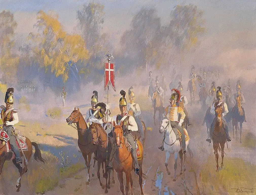 Утро на битката при Бородино. Отпътуване на кавалерийския полк към позицията. Художник Дмитрий Белюкин