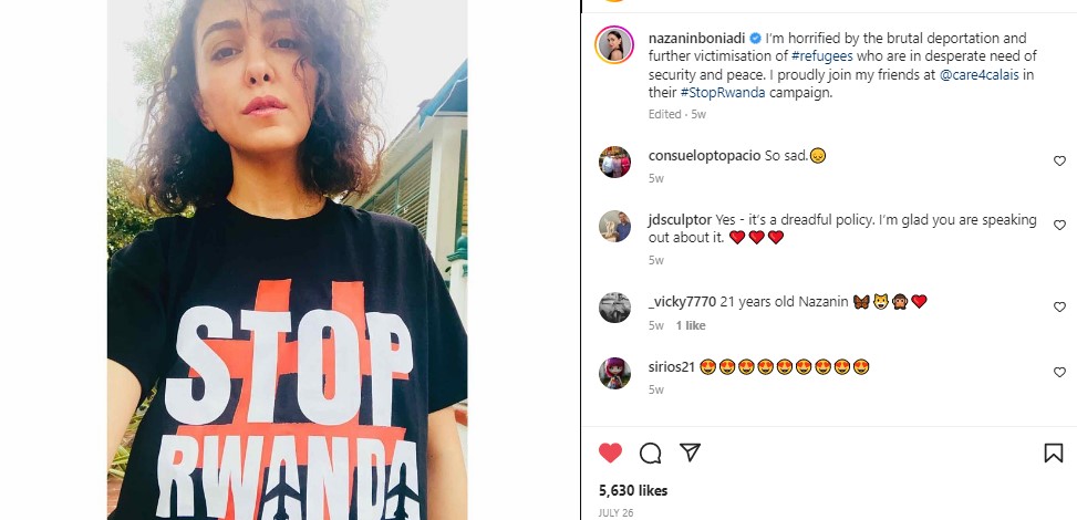 Activist Nazanin Talking About Rwanda Campaign By Wearing The Shirt That Says STOP RWANDA Source: Instagram