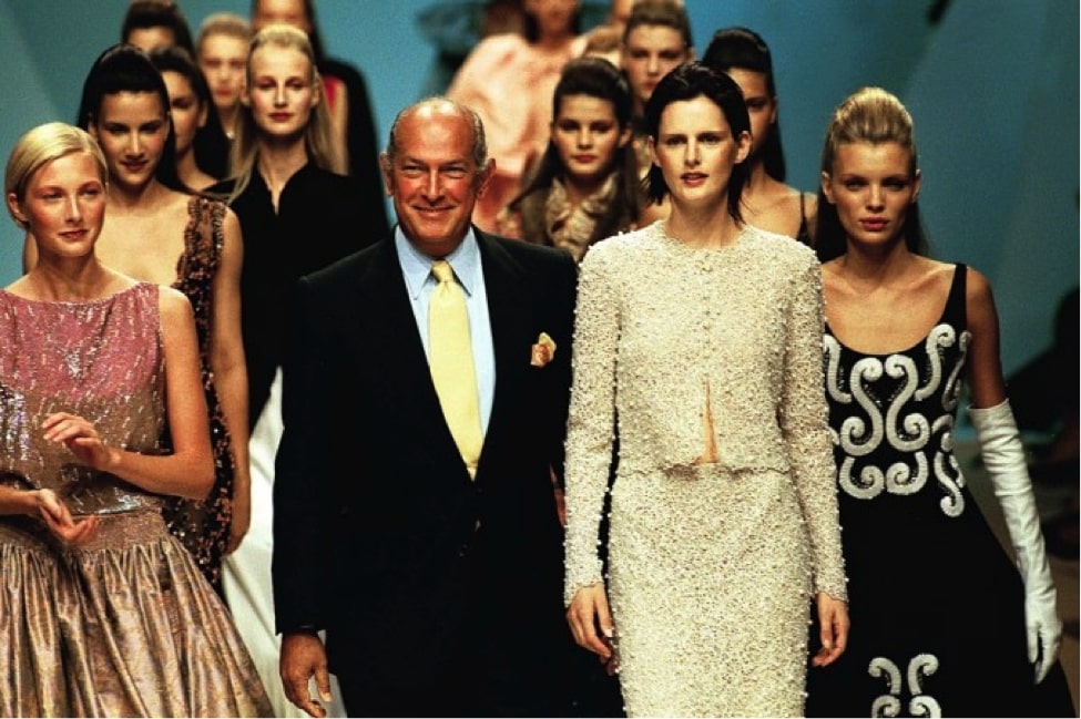 De la Renta married Francoise de Langlade, an editor-in-chief of French Vogue, in 1967. Francoise introduced her husband to some of the most influential members of fashion society and invited many of the rich and famous to his shows. His line—identified by its delicate silk prints, use of ruffles, soft silhouettes and vibrant palette—soon became synonymous with casual luxury. Women of means couldn’t get enough of his distinctly modern yet romantic looks, and for those who couldn’t afford his gowns, he offered a scent. His first perfume debuted in 1977.
