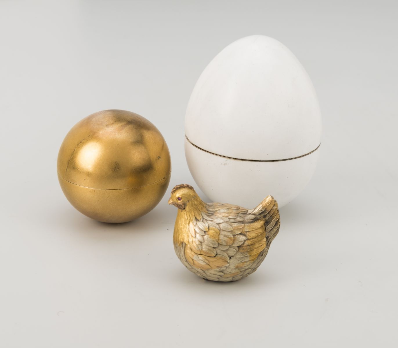 Яйцо «Курочка», подарок Александра III супруге императрице Марии Федоровне на Пасху 1885 года. Фирма Карла Фаберже, мастер Эрик Коллин. Золото, рубины, эмаль