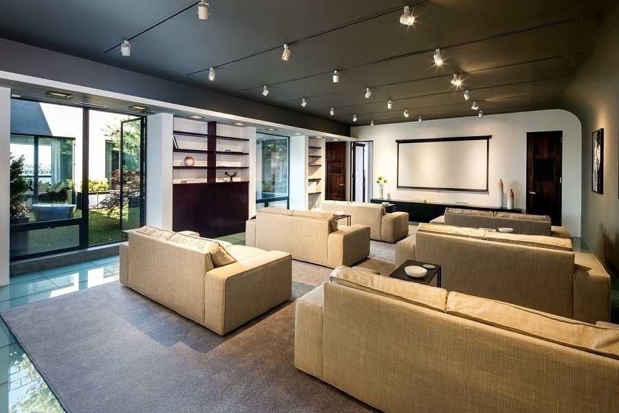 Интерьер домашнего кинозала Де Ниро лично придумал и воплотил при помощи дизайнера. Минимум 12 посадочных мест, большой экран, барная стойка и ничего лишнего. Видимо хозяева планировали смотреть фильмы с большим количеством друзей. Как и везде, стеклянный пол, комбинированный с деревянными элементами.