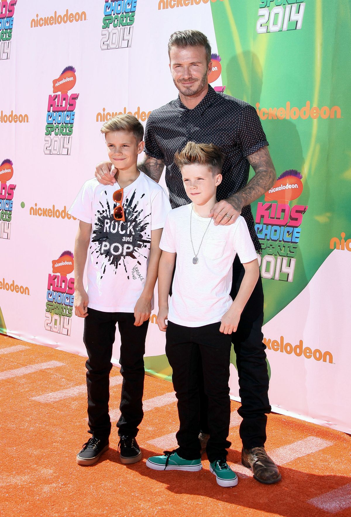 Дэвид Бекхэм с сыновьями Ромео и Крузом на церемонии вручения премии Kids’ Choice Sports Awards в Лос-Анджелесе, 18 июля 2014 г.
