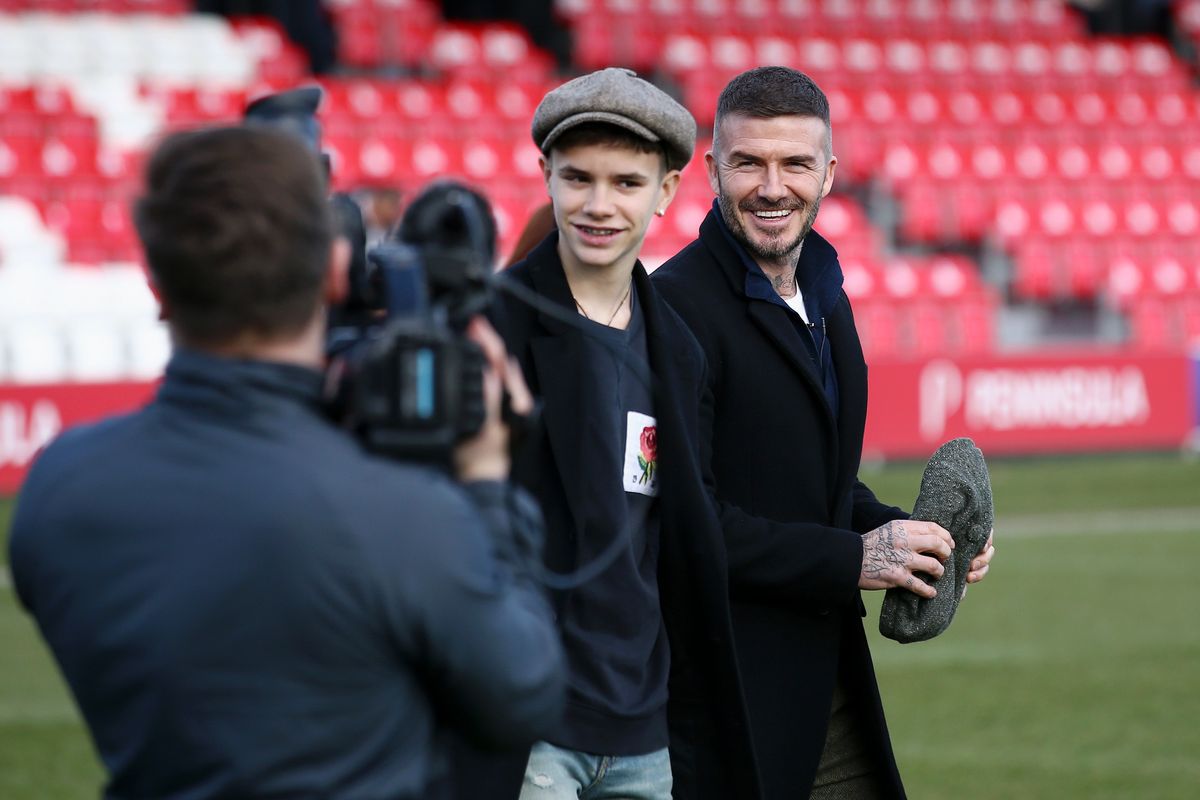 Дэвид Бекхэм с сыном Ромео на стадионе Peninsula в Солфорде, 16 февраля 2019 г.