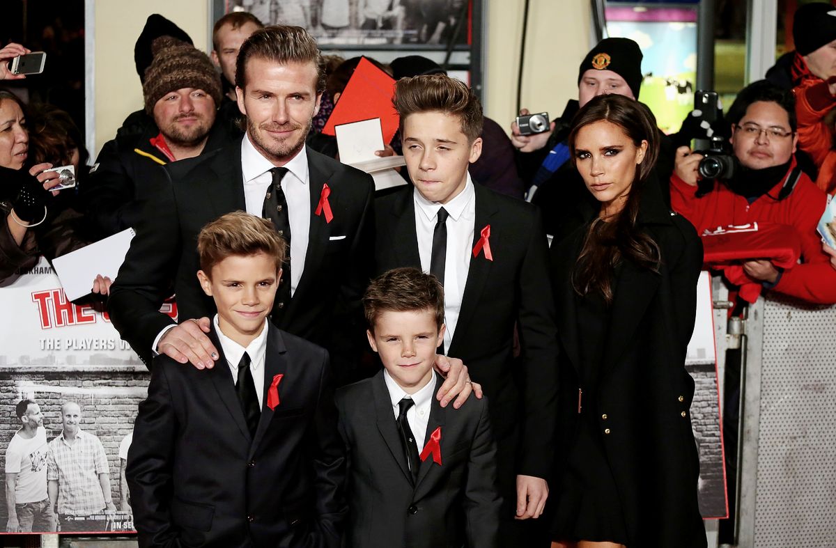 Дэвид Бекхэм с женой Викторией Бекхэм и с сыновьями Бруклином, Крузом, Ромео на премьере фильма «Класс 92» в Лондоне, 2013 г.