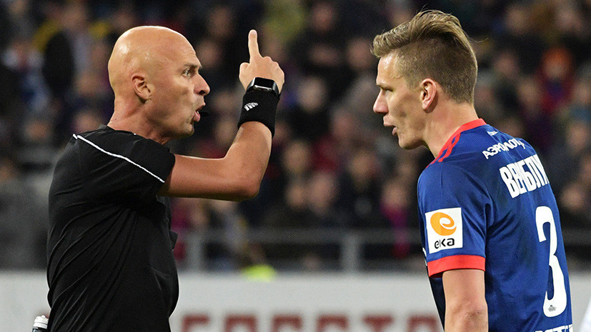 Игрок ПФК ЦСКА Понтус Вернблум и главный судья Сергей Карасёв