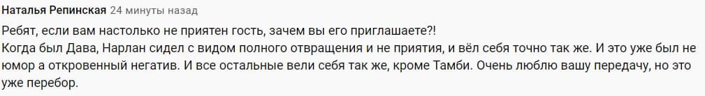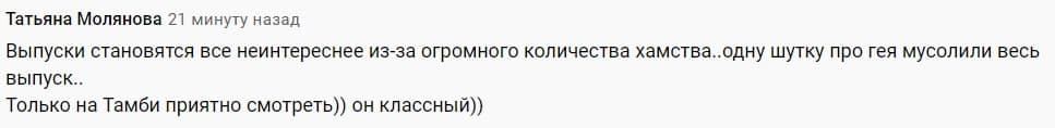 Как кажется завсегдатаям ютуба, проблема выпуска кроется в чересчур хамском отношении к гостям и попытках строить комические комментарии на одной и той же теме гомосексуальной ориентации. Шутки шутками, но в их количестве нужно знать меру, решили зрители. Однако зрители отметили, что общее неприятное впечатление сглаживает юмор Тамби.