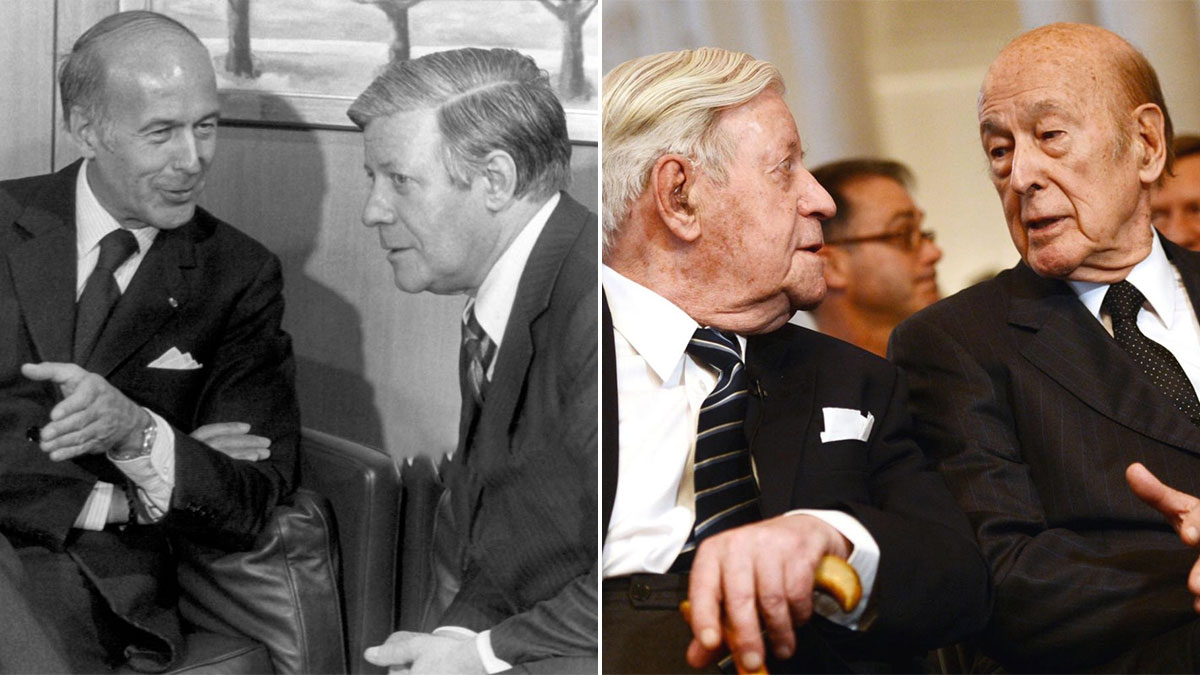 Валери Жискар д’Эстен с Гельмутом Шмидтом в 1977 и 2013 годах