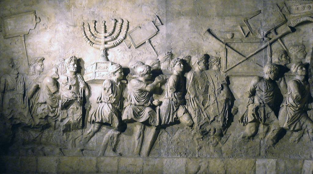 Фрагмент арки Тита в Риме. Римские воины грабят Иерусалимский храм