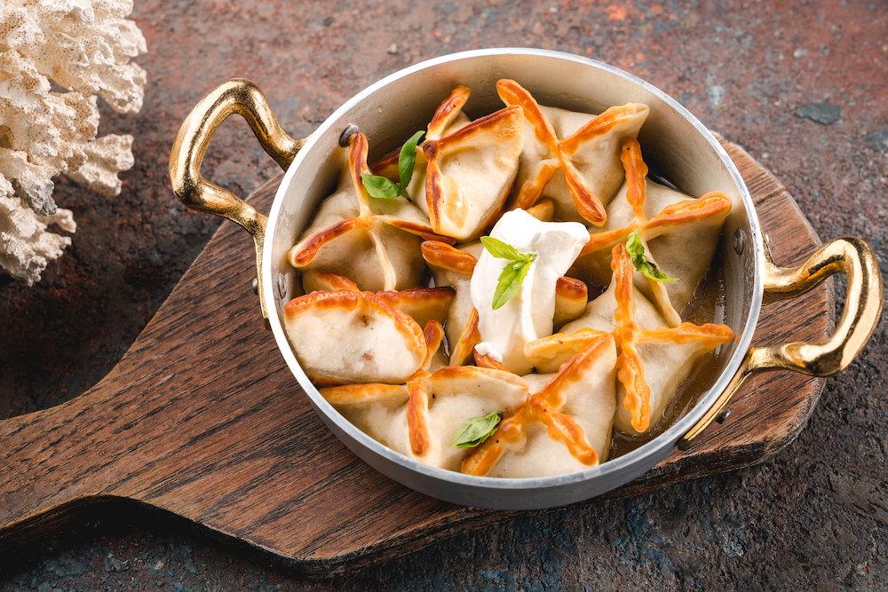 Ингредиенты: пшеничная мука — 320 г, кипяток — 0,75 стак., подсолнечное масло — 4 ст. л., вода — 0,5 л, лавровый лист — 3 шт., черный перец — 4-5 горошин, чеснок — 2-3 зубчика, зелень петрушки — 1 ст. л., сметана — 1 стак. Для начинки: сухие белые грибы — 20 шт., гречневая каша или отварной рис — 1 стак., подсолнечное масло — 4 ст. л., 1 луковица, 1 яйцо.