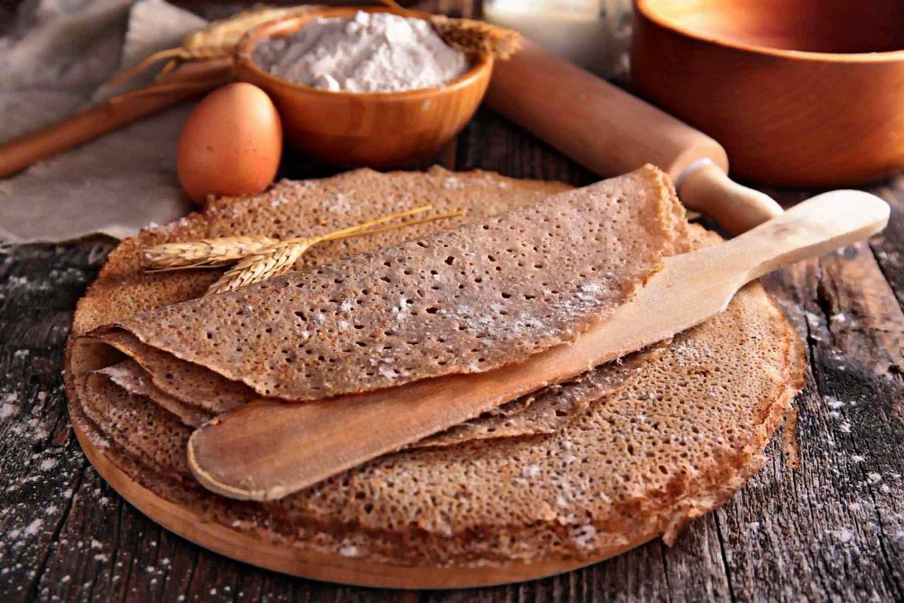 Ингредиенты: гречневая мука — 3,5 стак., пшеничная мука — 1,5 стак., теплая вода — 2,5 стак., кипящее молоко — 2 стак., дрожжи — 25 г, сливочное масло — 25 г, яйцо — 2 шт., сахар — 1 ч. л., соль — 1 ч. л., растопленное масло — 0,5 стак.