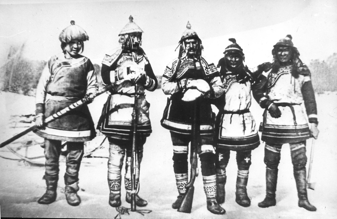 В.К. Арсеньев в удэгейском костюме (в центре) и удэгейцы с реки Анюй. Февраль 1909 г.