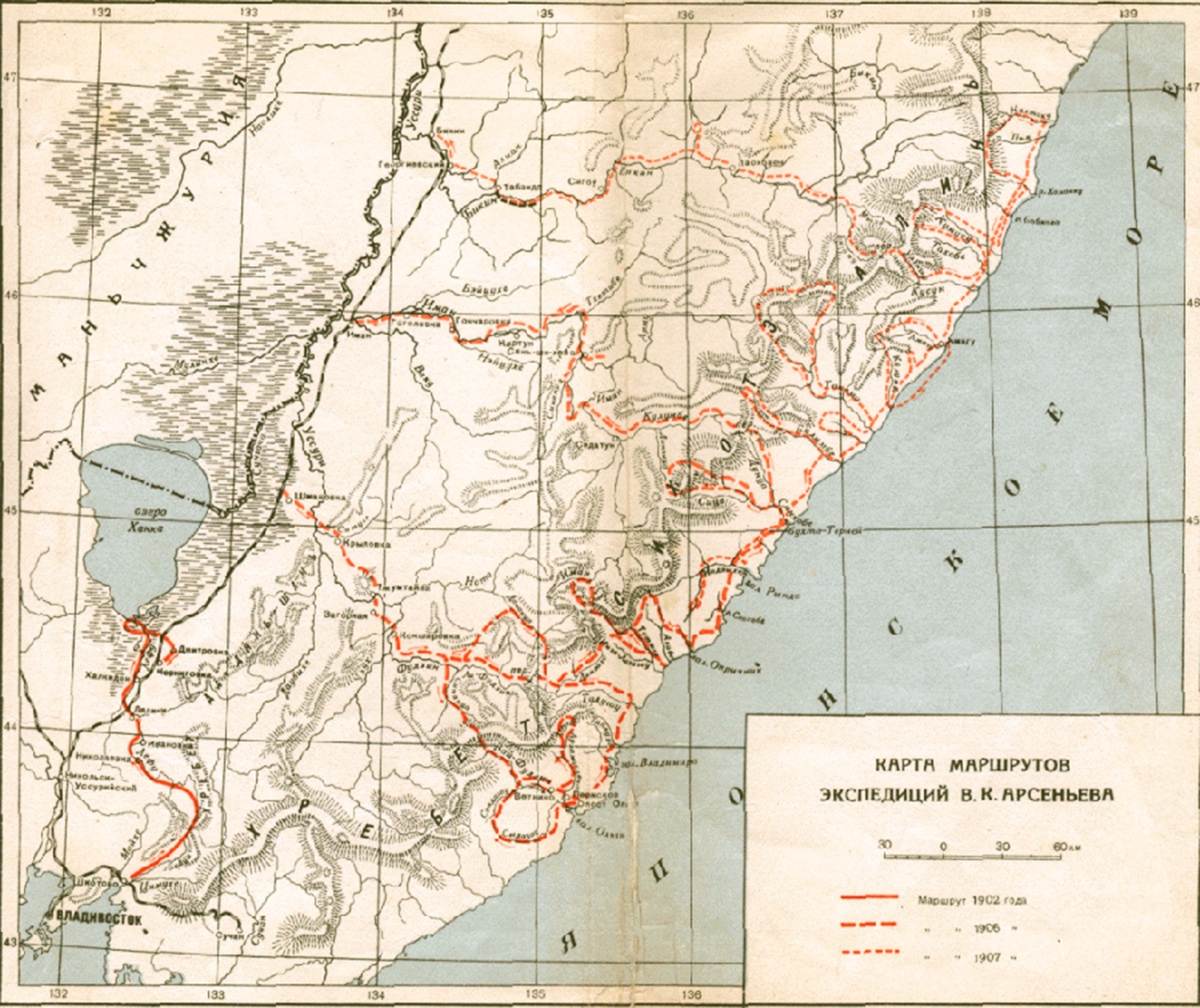 Карта маршрутов экспедиций Владимира Арсеньева.