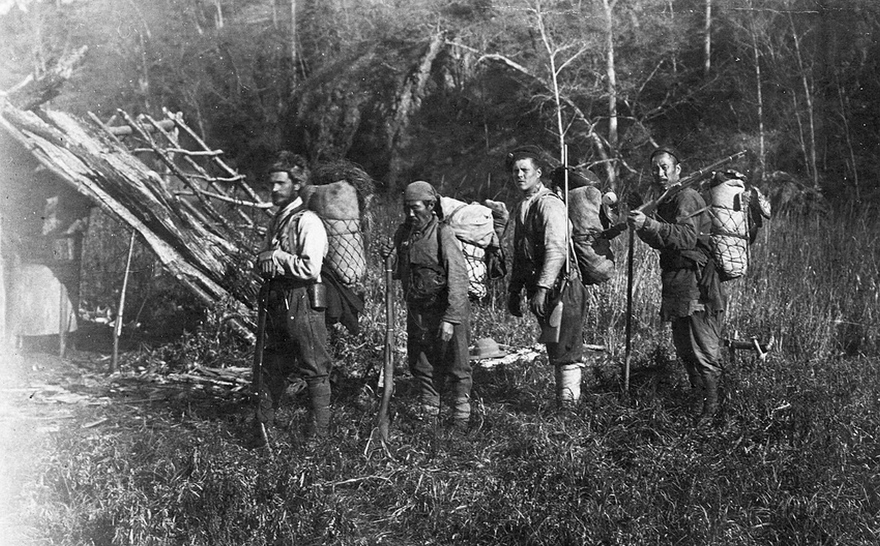 Cлева направо: Владимир Арсеньев, Дерсу Узала, солдат Фокин и Чжан-Бао в походе по бассейну реки Такема, 1907 год.