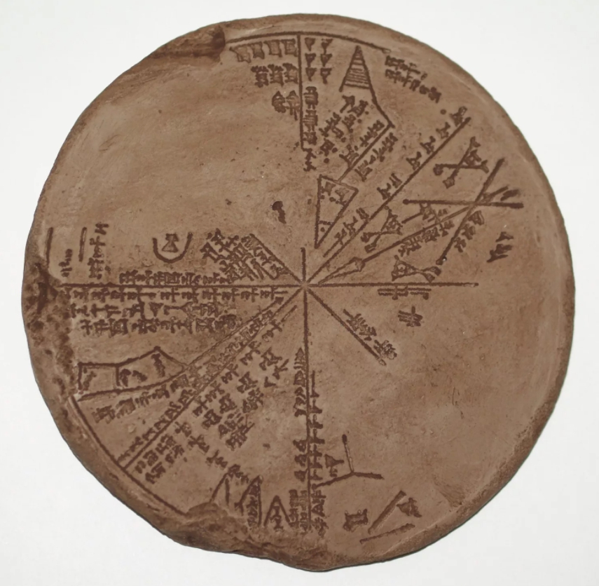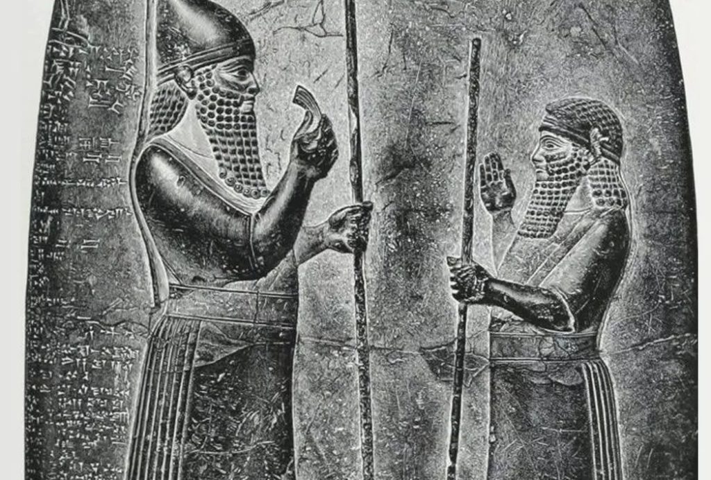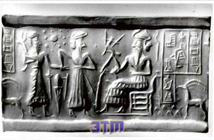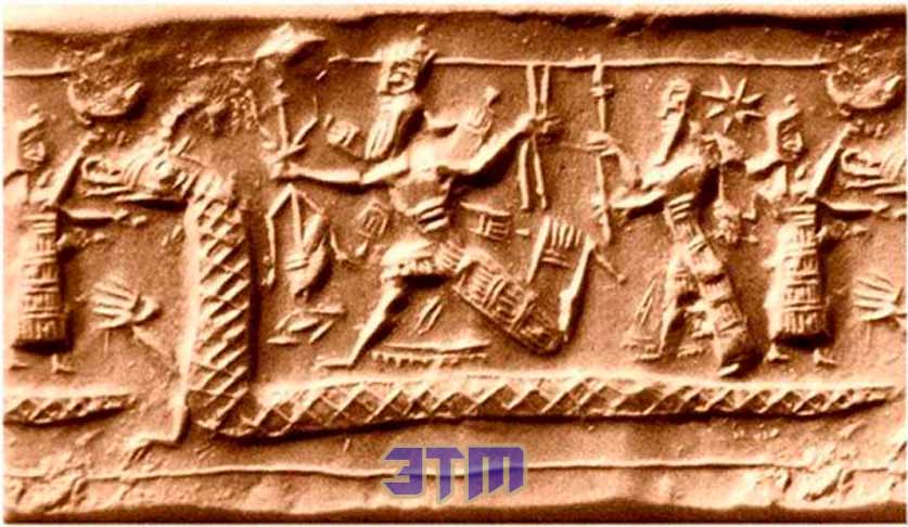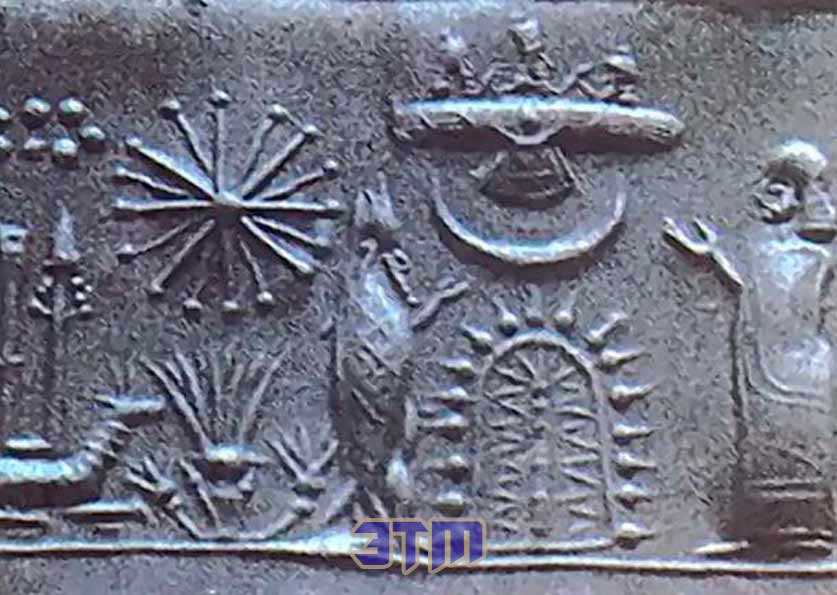 Печать 1-го тысячелетия с изображением богомольца и мудреца в рыбьей одежде перед стилизованным деревом с полумесяцем и крылатым диском над ним. Позади этой группы находится другая форма растения с сияющей звездой и звездным скоплением (скопление Плеяд) над ней.