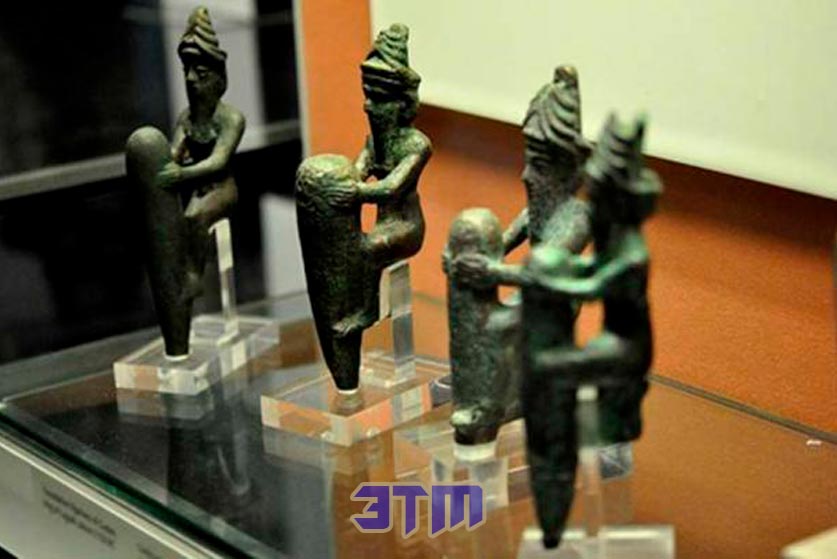 Четыре статуэтки из медного сплава, датируемые ок. 2130 г. до н.э., изображающие четырех древних месопотамских богов в характерных рогатых коронах.
