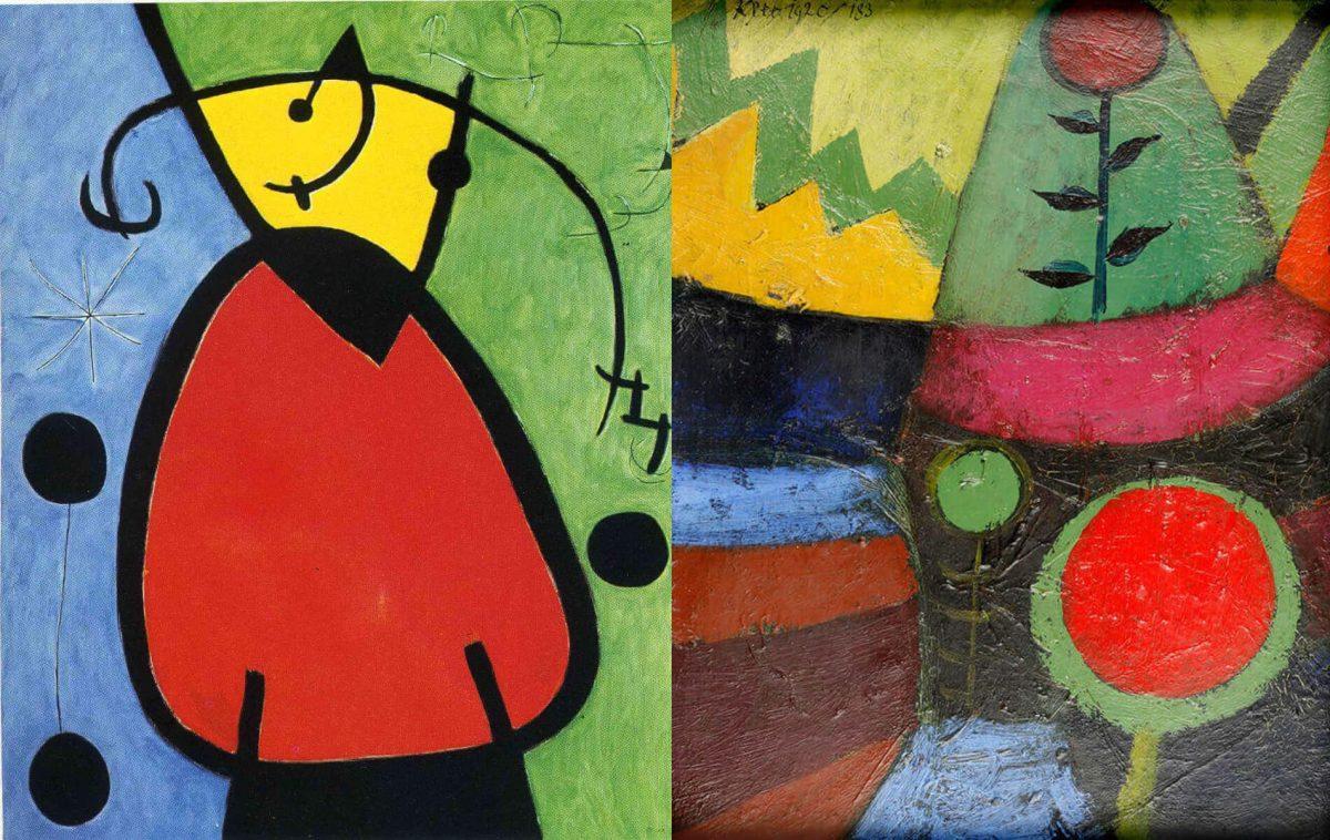 На самом деле в этих работах мало, чего общего. Большие цветовые пятна в стиле Гогена. Но все остальное – разное. Миро фантазирует. Нужно очень сильно постараться, чтобы в его “Рассвете” увидеть реальный рассвет. А вот Клее более предметен. Мы отчётливо видим цветки.