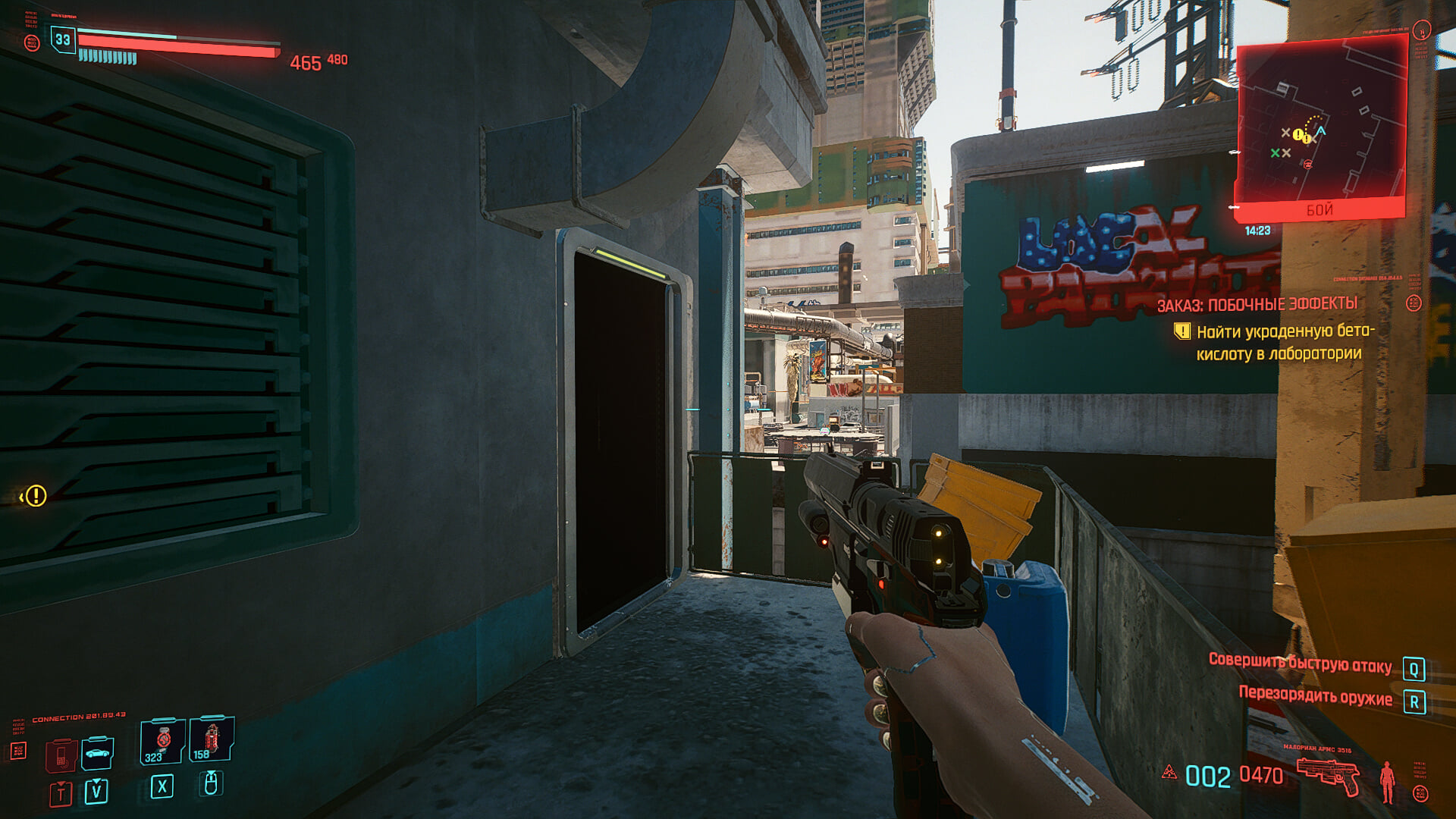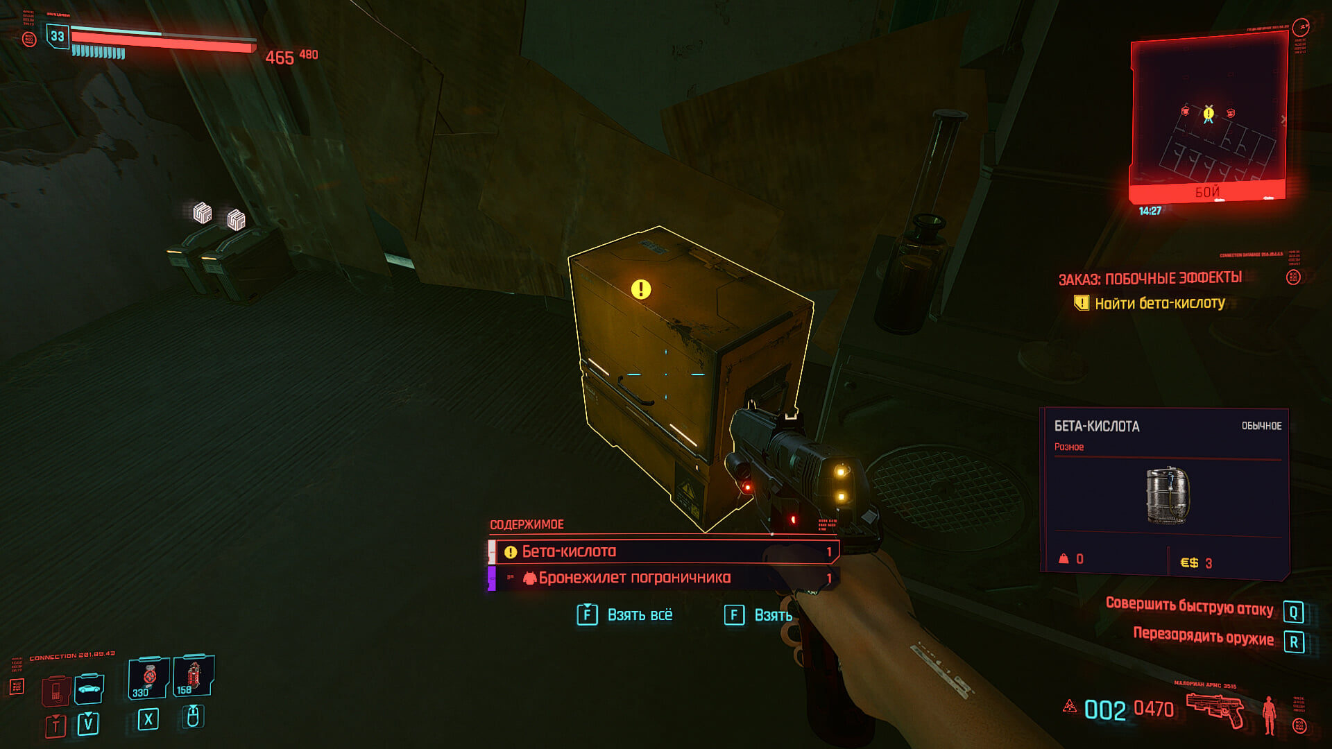 Внутри находятся 3 охранника, которых нужно нейтрализовать. К ним могут присоединиться охраняющие вход бандиты снизу, так что не начинайте перестрелку на улице. Забирайте бета-кислоту.