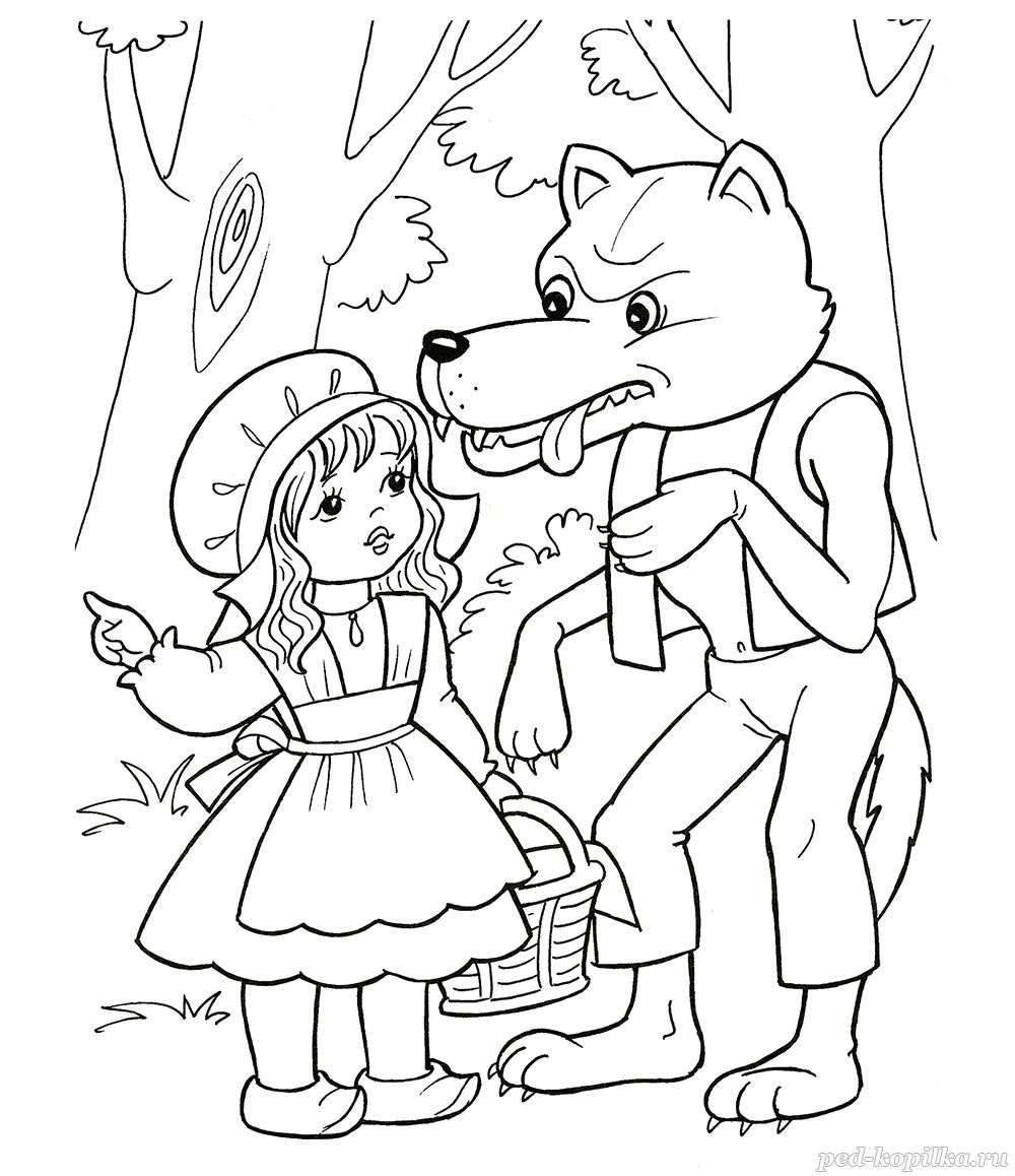 Очень захотелось ему съесть девочку, он не посмел: где-то близко стучали топорами дровосеки. Облизнулся Волк и спрашивает Красную Шапочку:
