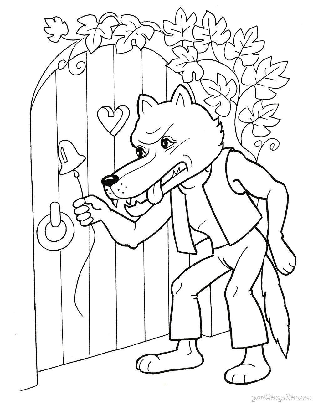 Голодный волк дёрнул за верёвочку, дверь и открылась. Бросился тогда он на бабушку и разом проглотил её.