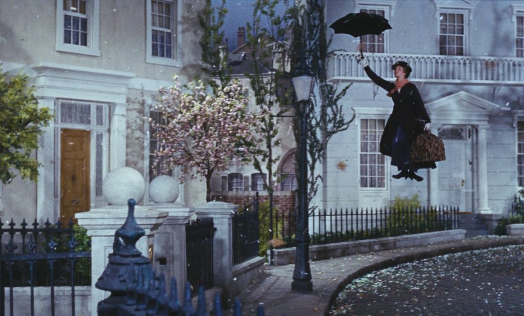 Максимум, что продемонстрировали – это подъем Мэри Поппинс по периллам в доме. Само появление няни – это простая склейка: вот пустая улица, где ее нет, а после плана-перебивки она уже есть. Значит, прилетела.