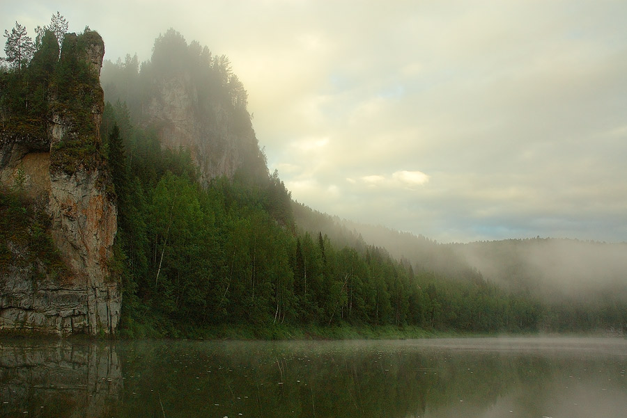 «…лишь повернули прочь от солнца, послышался шум, как отдаленный шелест леса. Течение становилось все слабее и слабее, а шум порога возрастал, и, после нескольких изгибней реки, быстрая волна вдруг подхватила шитик… Саженях в ста от Прохора бежали две воды: шумно бурлящая, рябая и, дальше, – тихая, застеклелая, вся в солнечном пожаре. Грань этих вод – предел порога…».
