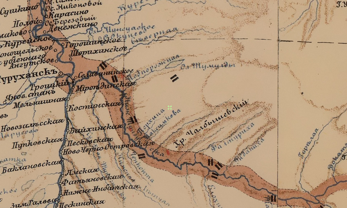 Подтверждением описания Нижней Тунгуски также служат слова Петра Громова, объясняющего Прохору, как попасть на Угрюм-реку: «Тут река Большой Поток предвидится. Отсюда перемахнешь через волок на Угрюм-реку, в самую вершину… – Это деревня Подволочная на Угрюм-реке. Там построишь плот либо купишь большую лодку, – шитик называется, – сухарей насушишь… А весной, по большой воде поплывешь вниз».
