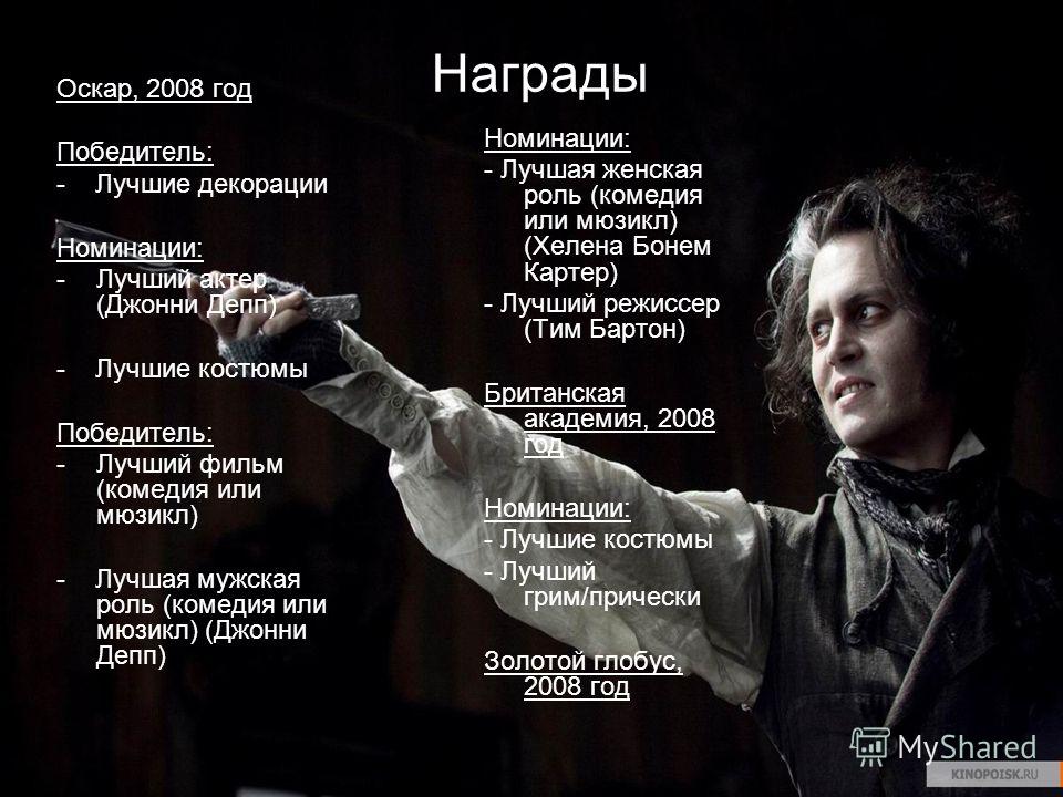 Награды Оскар, 2008 год Победитель: — Лучшие декорации Номинации: -Лучший актер (Джонни Депп) — Лучшие костюмы Победитель: -Лучший фильм (комедия или мюзикл) — Лучшая мужская роль (комедия или мюзикл) (Джонни Депп) Номинации: — Лучшая женская роль (комедия или мюзикл) (Хелена Бонем Картер) — Лучший режиссер (Тим Бартон) Британская академия, 2008 год Номинации: — Лучшие костюмы — Лучший грим/прически Золотой глобус, 2008 год