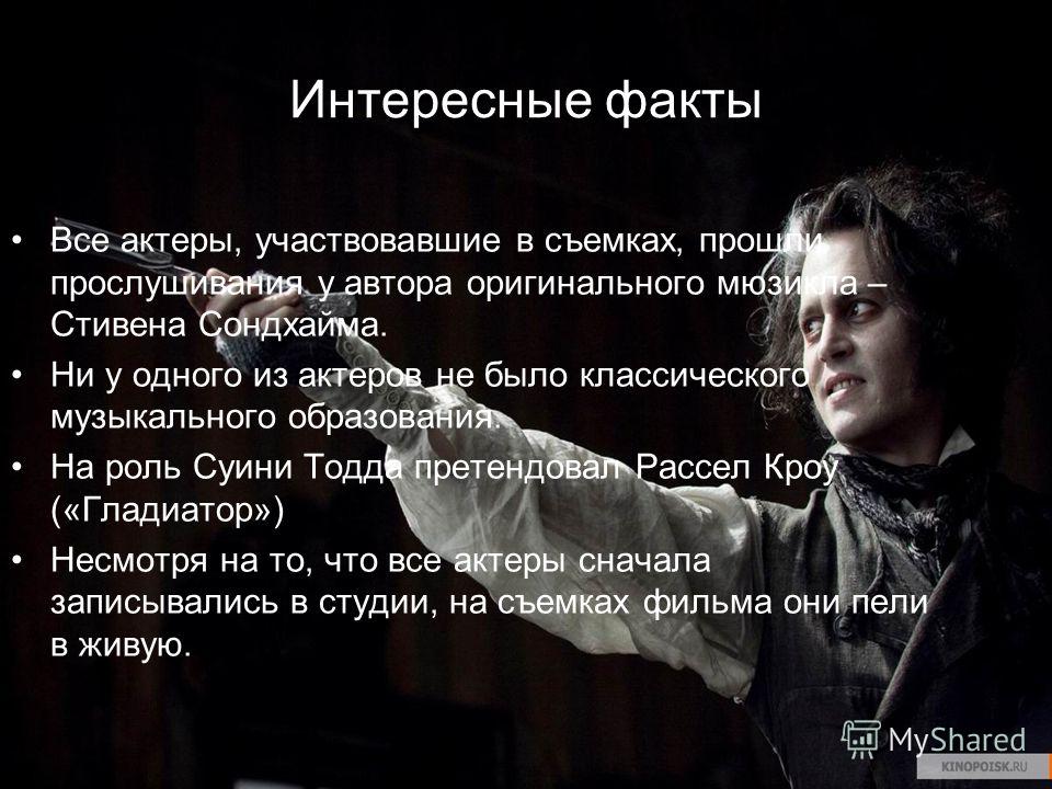 Интересные факты Все актеры, участвовавшие в съемках, прошли прослушивания у автора оригинального мюзикла – Стивена Сондхайма. Ни у одного из актеров не было классического музыкального образования. На роль Суини Тодда претендовал Рассел Кроу («Гладиатор») Несмотря на то, что все актеры сначала записывались в студии, на съемках фильма они пели в живую.