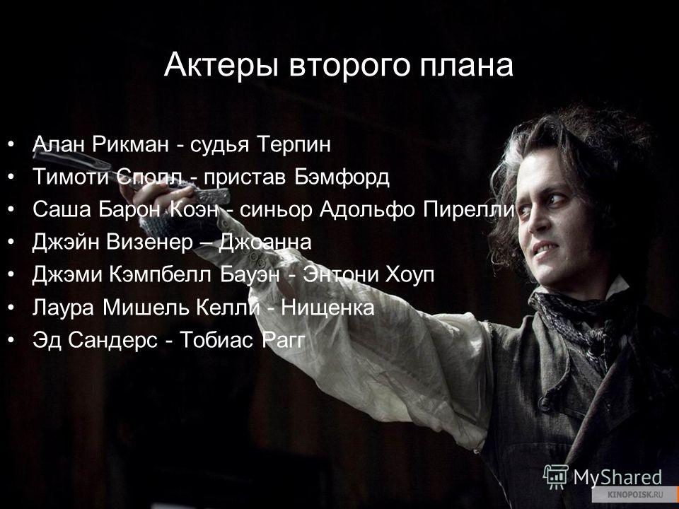 Актеры второго плана Алан Рикман — судья Терпин Тимоти Сполл — пристав Бэмфорд Саша Барон Коэн — синьор Адольфо Пирелли Джэйн Визенер – Джоанна Джэми Кэмпбелл Бауэн — Энтони Хоуп Лаура Мишель Келли — Нищенка Эд Сандерс — Тобиас Рагг