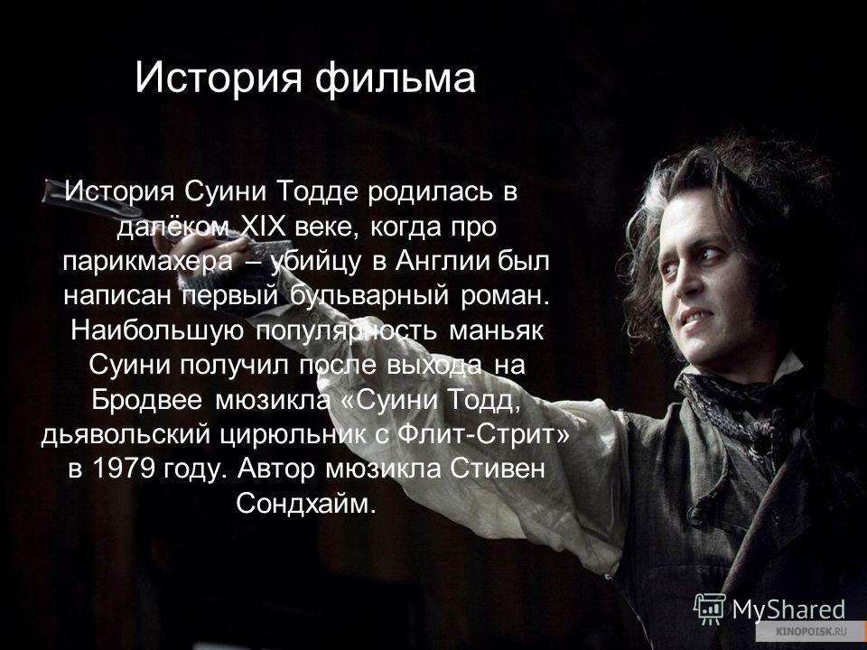 История фильма История Суини Тодде родилась в далёком XIX веке, когда про парикмахера – убийцу в Англии был написан первый бульварный роман. Наибольшую популярность маньяк Суини получил после выхода на Бродвее мюзикла «Суини Тодд, дьявольский цирюльник с Флит-Стрит» в 1979 году. Автор мюзикла Стивен Сондхайм.