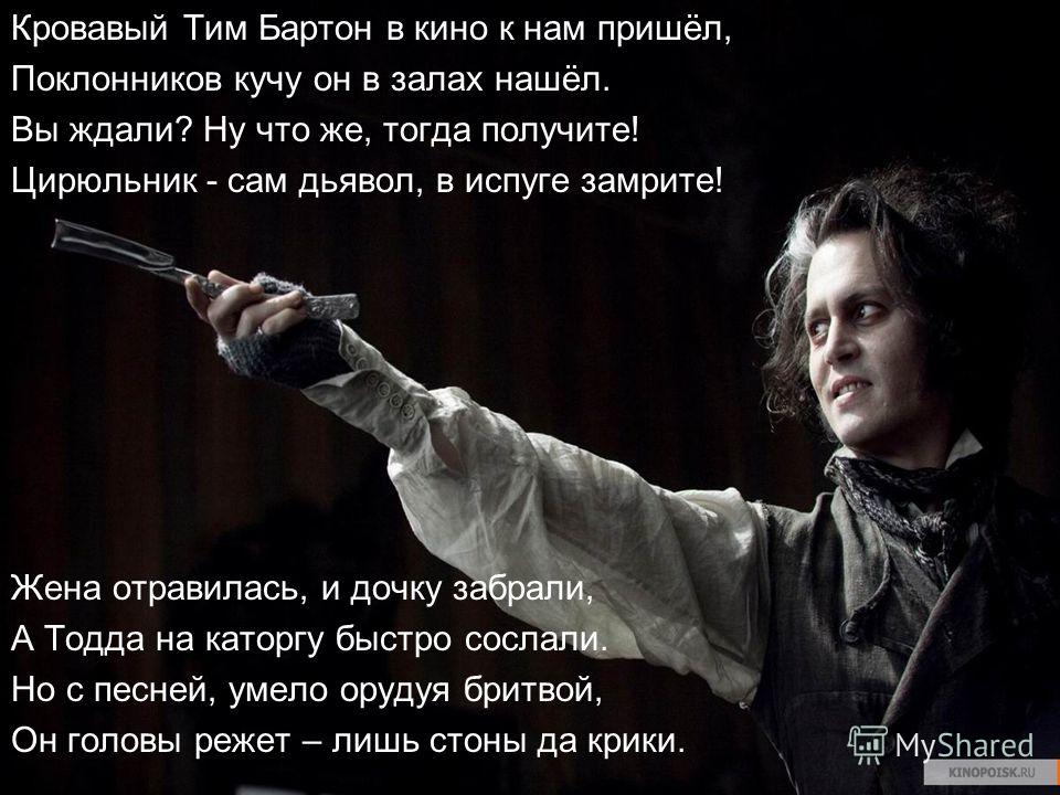 Кровавый Тим Бартон в кино к нам пришёл, Поклонников кучу он в залах нашёл. Вы ждали? Ну что же, тогда получите! Цирюльник — сам дьявол, в испуге замрите! Жена отравилась, и дочку забрали, А Тодда на каторгу быстро сослали. Но с песней, умело орудуя бритвой, Он головы режет – лишь стоны да крики.