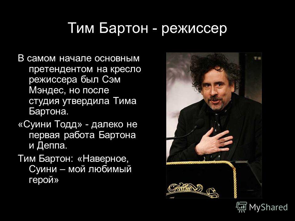 Тим Бартон — режиссер В самом начале основным претендентом на кресло режиссера был Сэм Мэндес, но после студия утвердила Тима Бартона. «Суини Тодд» — далеко не первая работа Бартона и Деппа. Тим Бартон: «Наверное, Суини – мой любимый герой»