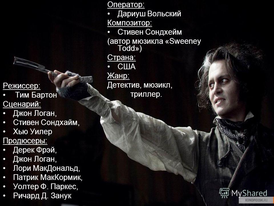 Режиссер: Тим Бартон Сценарий: Джон Логан, Стивен Сондхайм, Хью Уилер Продюсеры: Дерек Фрэй, Джон Логан, Лори МакДональд, Патрик МакКормик, Уолтер Ф. Паркес, Ричард Д. Занук Оператор: Дариуш Вольский Композитор: Стивен Сондхейм (автор мюзикла «Sweeney Todd») Страна: США Жанр: Детектив, мюзикл, триллер.