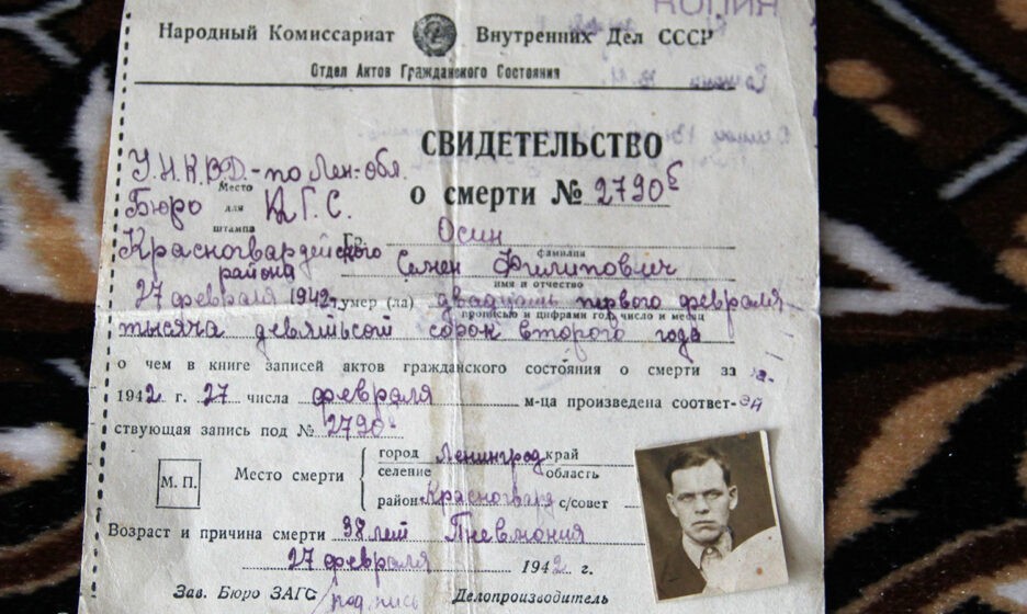 — Мы его даже не узнали: таким старым стал, подумали сначала, дедушка чей-то, а ему всего 38 было, — Нина Семеновна протягивает крошечную фотографию два на два. — Умер он в середине февраля. Мама не захотела его в братскую могилу класть. Богословское кладбище почти напротив дома было, мы видели, как трупы возили, как траншеи взрывали, как покойников туда скидывали. Пошла договариваться, и с нее на кладбище запросили две наших с Галей карточки. Что делать? Папиного хлеба не будет, а без наших карточек — вообще смерть.