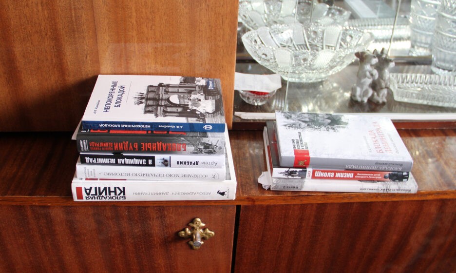 На старенькой, но добротной «стенке», модной в прошлом веке, разложены книги с закладками. В названии каждой — страшное слово «блокада»: