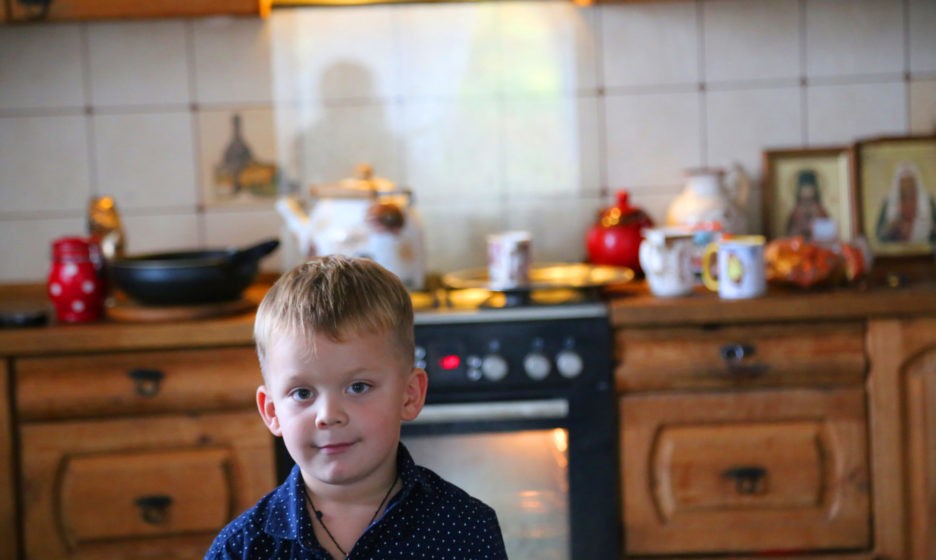 У плиты стоит Олеся, накладывает в тарелку пирог. Улыбается, смотрит на мужа. Годовалый Степа требует внимания.