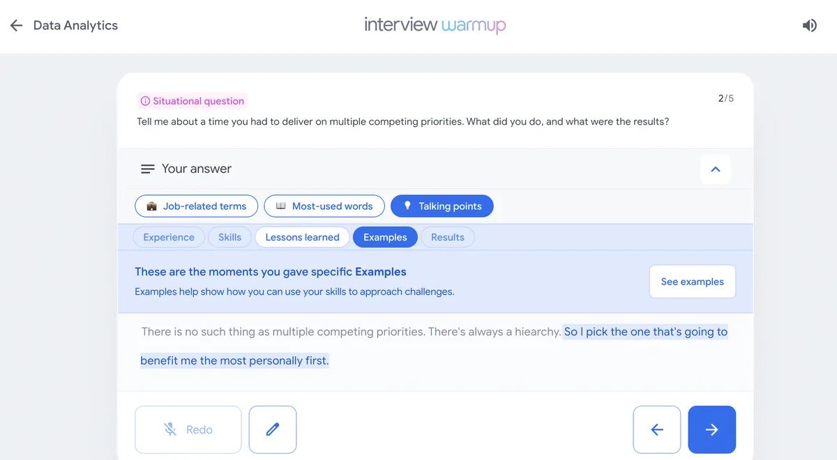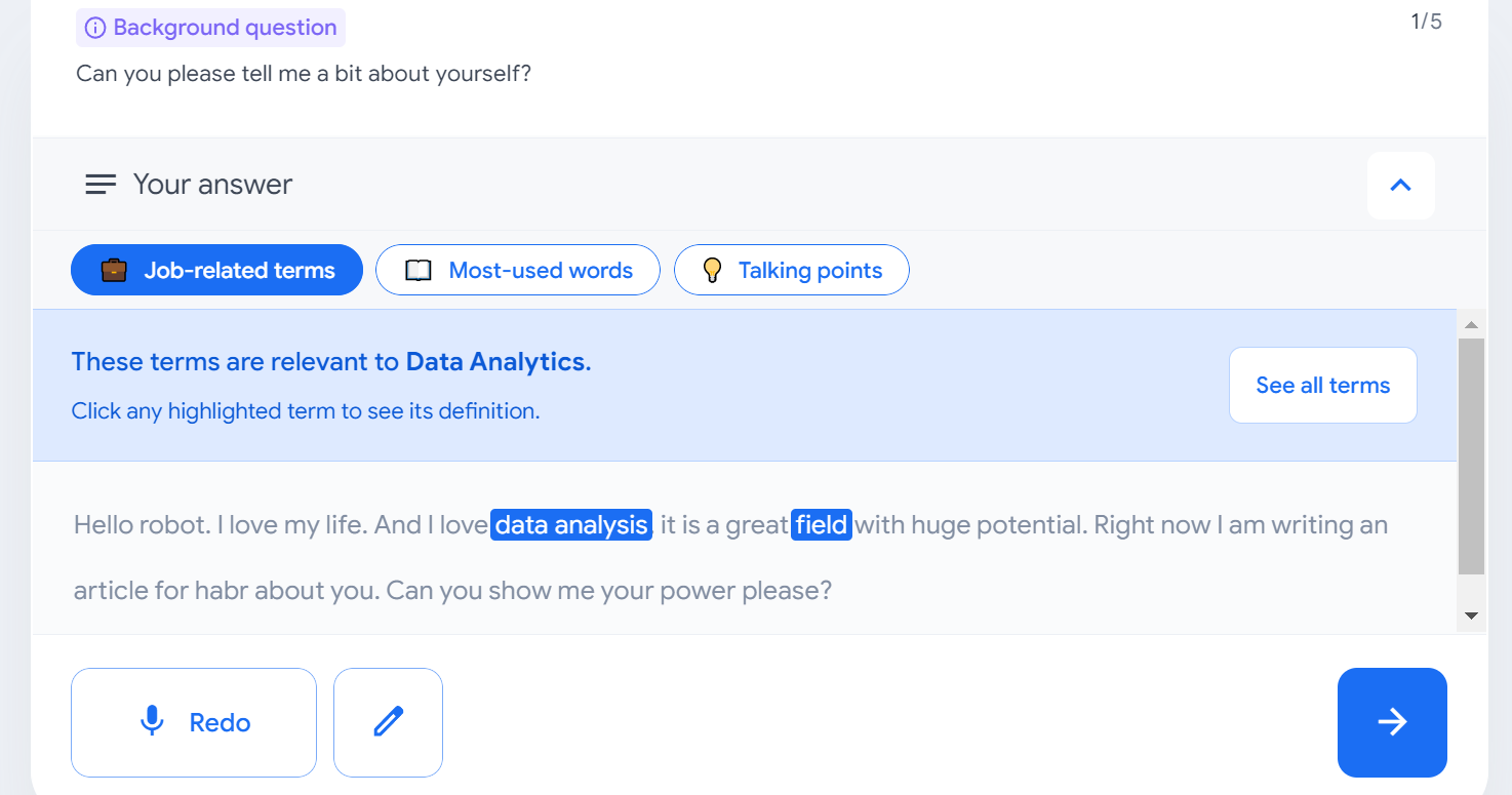 С другой стороны, видно, что робот действительно пытается быть полезным. Он дает вам список ключевых слов, которые можно использовать в интервью. Их очень много. Ну а если во время проверки он найдет у вас в ответе и нужные words, и нужные job-related terms, и несколько talking points, и всё это подсветит, значит, вы царь горы. Можно идти прямо к Брину и требовать повышения.