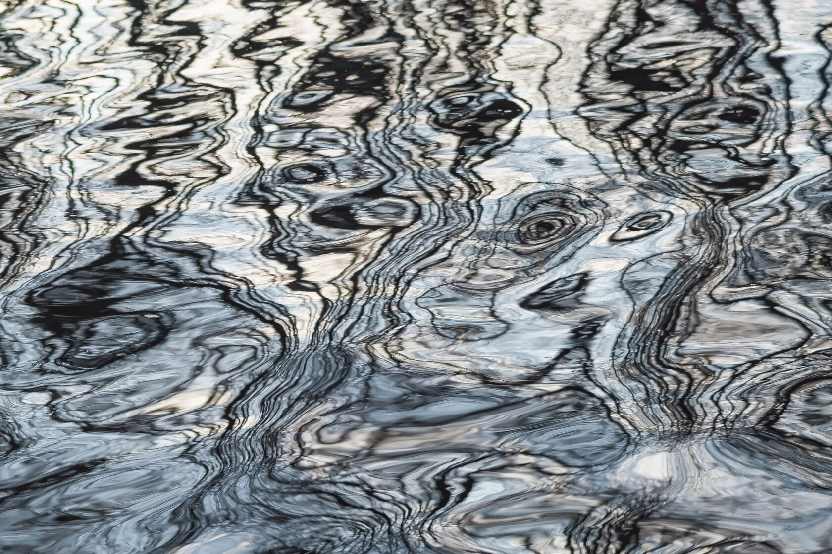 Ну а это, традиционно, водная гладь с отражением весенних деревьев без листвы. Такую картинку на водной глади удалось наблюдать лишь однажды, когда не было пены, не качали понтонный мост, и небо было вечерне-синее. Случайно заметила меняющийся рисунок на почти спокойной поверхности и успела сделать всего несколько кадров — очень быстро всё исчезло…