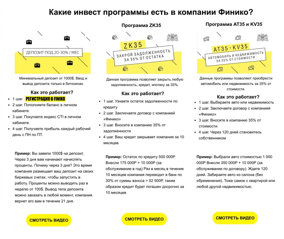 Finiko обещает своим вкладчикам стабильный доход выше рынка. На сайте существует несколько программ, суть которых сводится примерно к одному: сервис берёт у клиента деньги, якобы вкладывает их на бирже и получает прибыль. Компания предлагает доходность до 35% на закрытие кредита, покупку недвижимости или автомобиля. Например, если внести 35% долга на счёт, то через 10 месяцев компания обязуется выплатить оставшуюся сумму кредита.