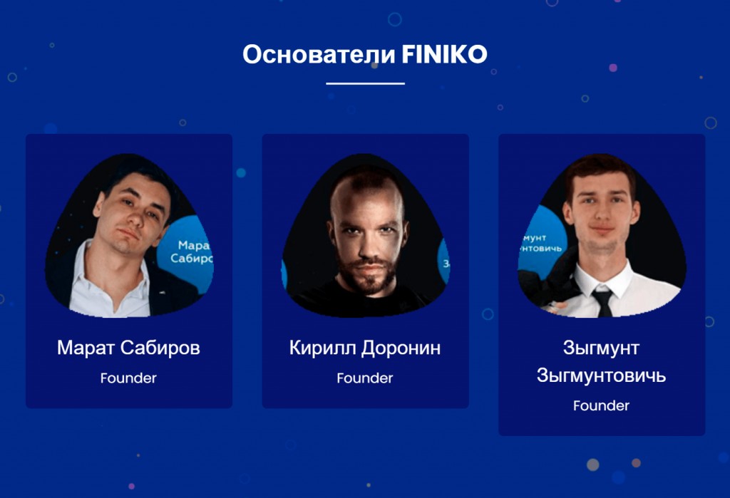 Основатель и вдохновитель Finiko – казанский «предприниматель» Кирилл Доронин. Он называет себя руководителем платформы, делает анонсы и периодически выкладывает видеообращения про Finiko в своём инстаграме. В 2014 году Доронин запустил компанию «Эскалат», обещавшую закрыть за должников любые кредиты – фирма быстро закрылась и получила множество негативных отзывов.