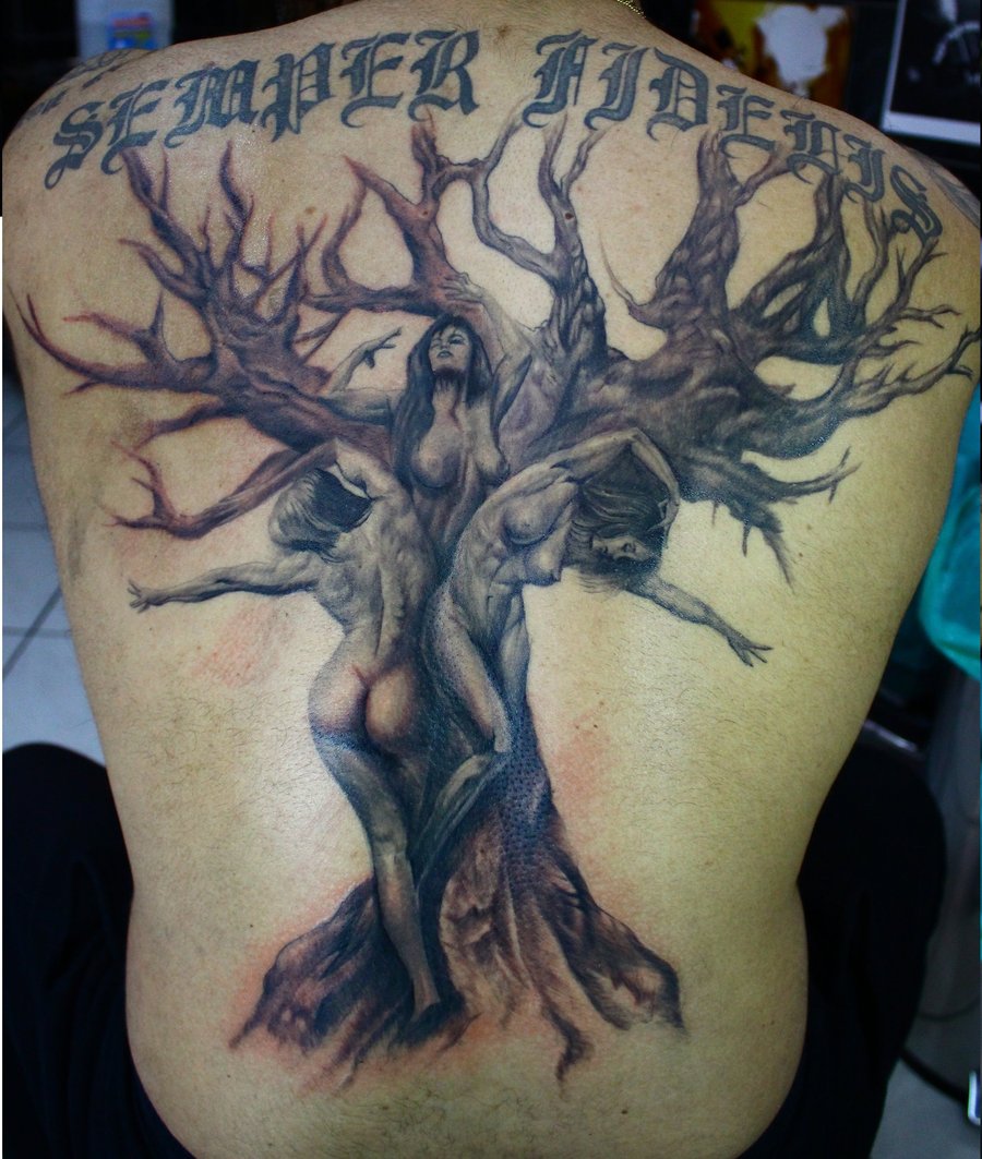 Большие тату выполняются также в стиле биоорганики, который весьма необычен и своеобразен. Такие большие татуировки чаще выбирают мужчины, ведь они объединяют природные мотивы и реалистические рисунки, абстракции.