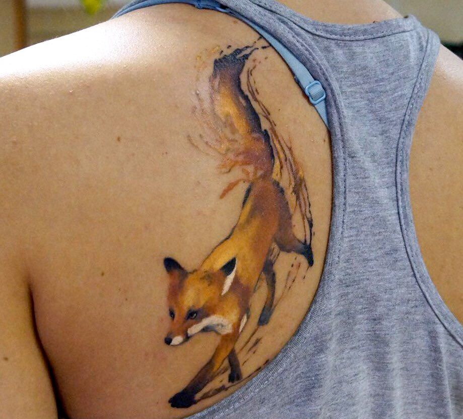 Можно в разных вариациях заметить на теле лису. Тату наносят и мужчины, и женщины. В первом варианте это обычно голова животного, во втором небольшой зверек, изображенный в полный рост.